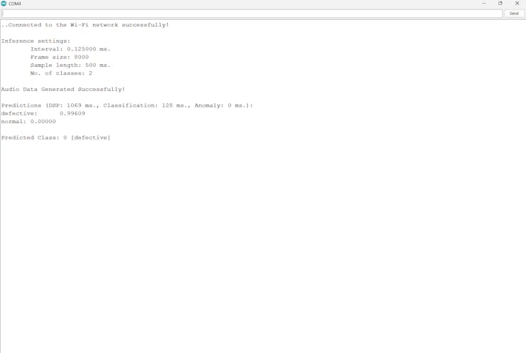 After training and testing my neural network model (Audio MFE), I deployed the model as an Arduino library and uploaded it to XIAO ESP32C6. Therefore, the device is capable of detecting anomalous sound emanating from the cooling fans by running the neural network model onboard without any additional procedures or latency.