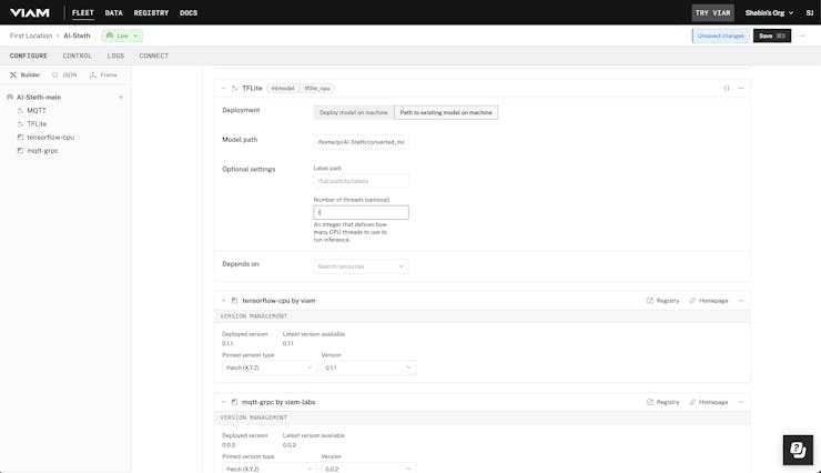 Now go back to the Viam builder tab and change the tensorflow-cpu service to the TFLite-CPU service and in the attributes provide the TFLite model path.