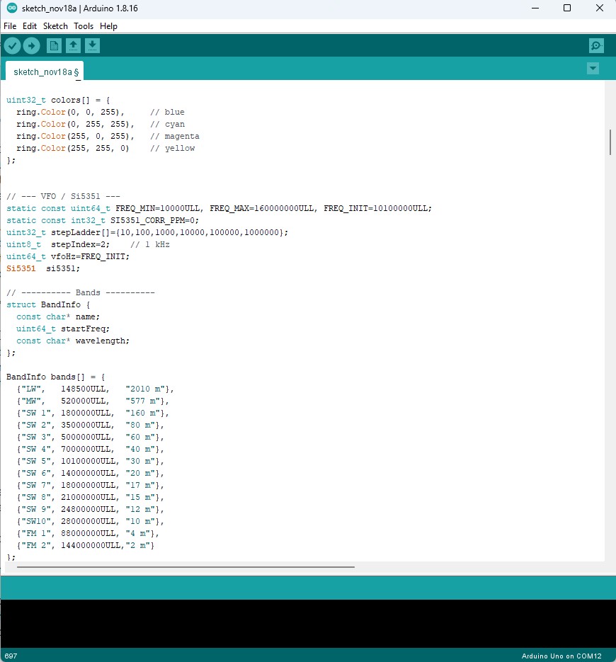 In the lower part of the display, is presented the generated frequency with large blue numbers. Immediately above this information, on the sides in yellow letters, is the Band and Wavelength, and in the middle is shown the step with which the scales move when turning therotary encoder. At the bottom are two buttons B+ and B- which are touch-sensitive and are used to change the band.