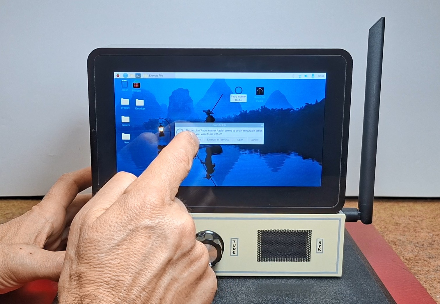 And now the most interesting part, let's see how the device works in real conditions. We start the operating system, on whose desktop there is an Internet radio icon, which is a shortcut to the python script "retro_ui". The icon is started, and the entire desktop turns into a vintage tube radio scale.
