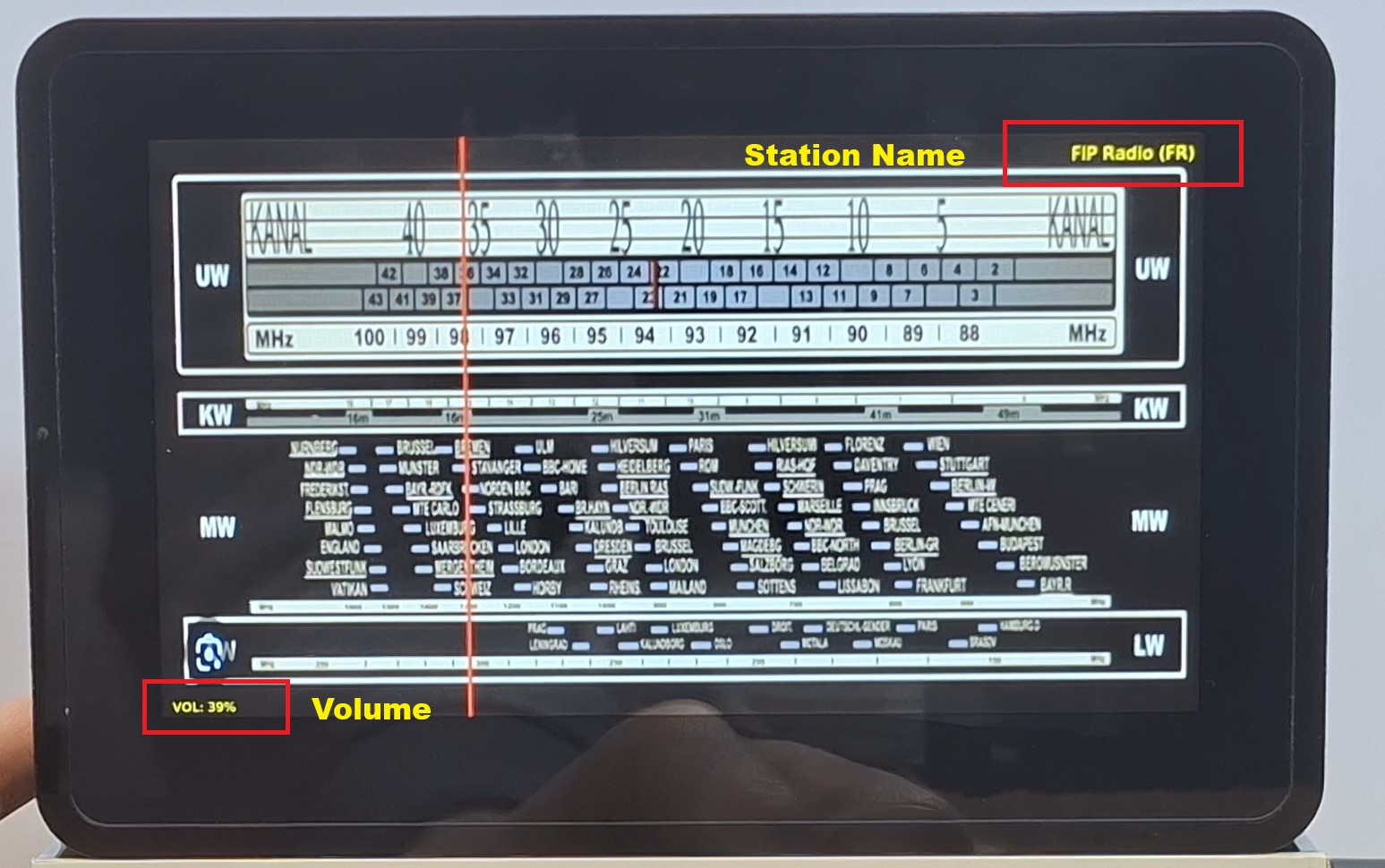 By turning the rotary encoder, the red pointer also moves. It can be noticed that the pointer stops, i.e. jumps at precisely certain places and does not move continuously. These points are the entered Internet radio stations. We enter the addresses of the desired Internet radio stations in the "stations.txt" file, which is located in "/home/pi/radio/stations.txt". The entire display (scale) is divided into as many equal parts as we have entered stations (for example, I currently have 22 stations entered). In a future version, more "pages" can be created with a certain number of Internet radios, for example, each page should contain a different genre of music. At the top right of the display in small letters is the name of the station, and at the bottom left the "Volume" value from 0 to 100.
