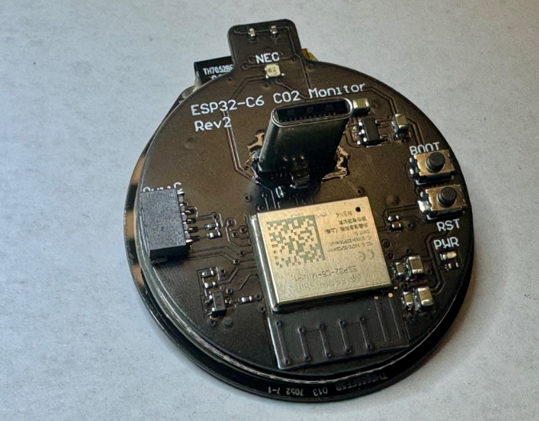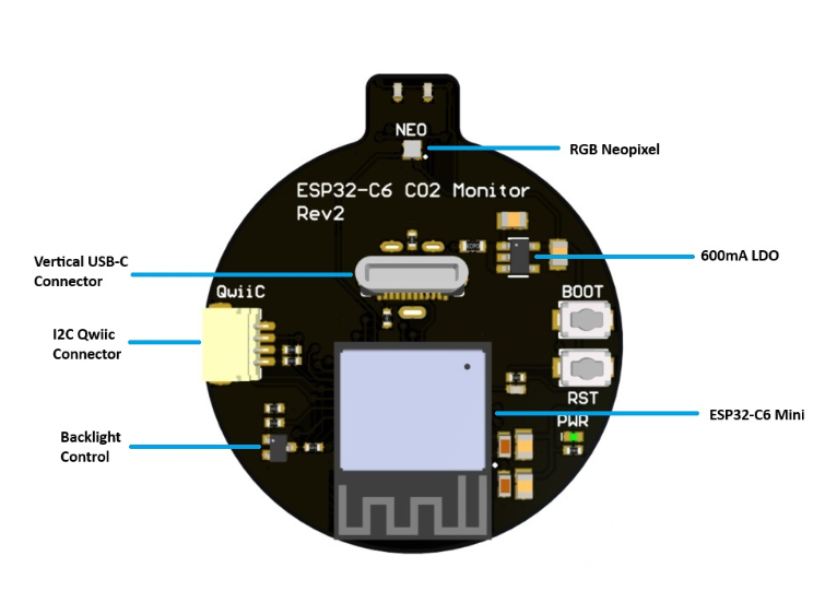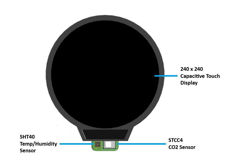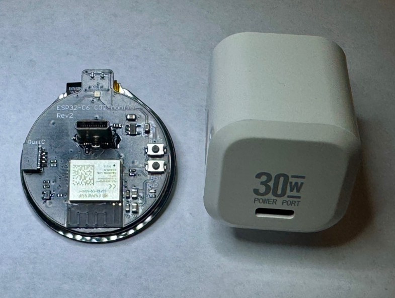 This custom board designed in Altium is powered by a USB-C phone charger and is the same size as the display using as few parts as possible. A few features I've added are backlight control for dimming, a Qwiic i2c connector for adding other sensors and sensors on the front side. Problems with this design are the delicate push and pull stress on the USB-C connector. Any side to side push on the board while powered up will easily break the connector off the board. The other is the temperature value displayed. The STCC4 has a built in heater and this combined with heat generated by the backlight, the ESP32 running at full speed and the copper pour on the top and bottom all up the temperature displayed.