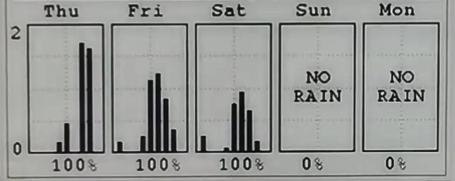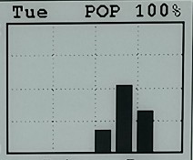 - The lower half of the display contains the forecasts for the next 5 days of the week. Analogous to the previous description, the day is indicated at the top, and the POP value in percentage at the bottom. The amount of precipitation is expressed on the far left, but now the maximum value is dinamicly adjusted depending on the maximum predicted amount of precipitation throughout the next five days.