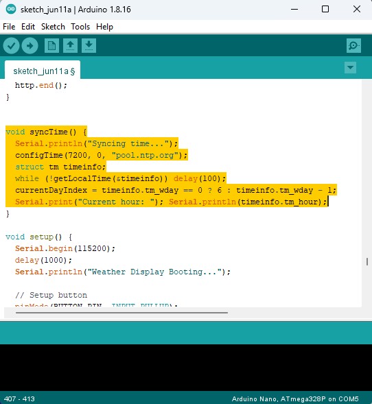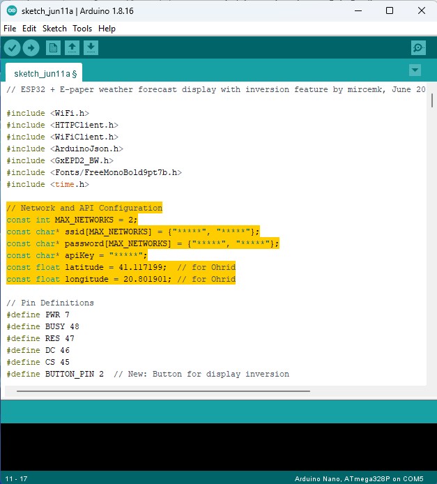 Then we enter the previously generated API key for the specific location from the openweathermap site, as well as the coordinates (latitude and longitude). Also in the "void syncTime" function in the "config time" line we need to enter the difference between UTC and local time in seconds. (For my location, local time is UTC + 2h, so I put 7200 sec).