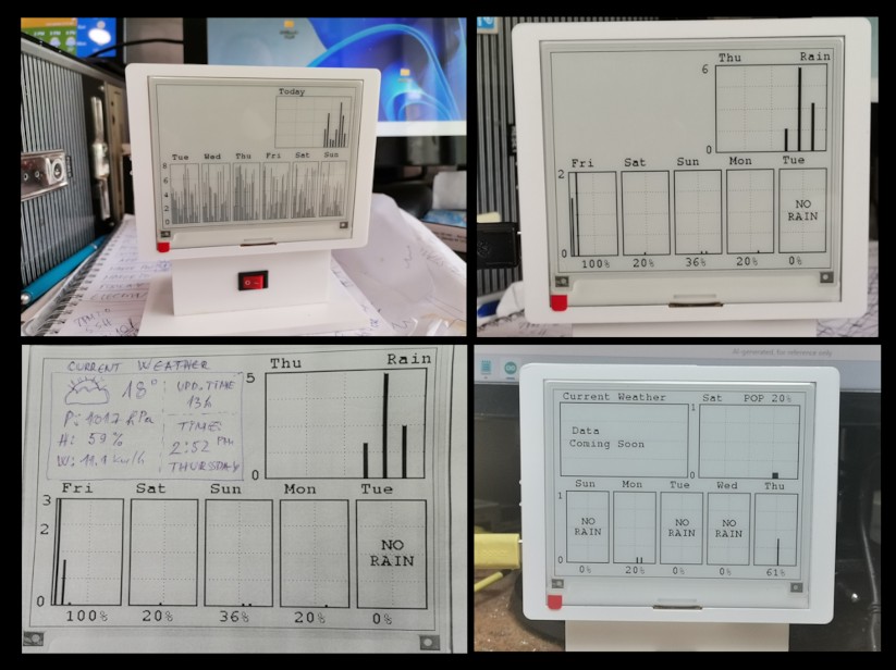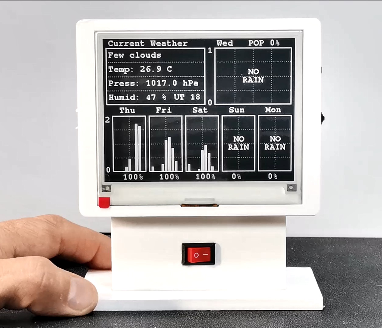 This is elegant e-paper weather display that shows current conditions and 5-day Rainfall (Percipitation) forecasts using ESP32 and OpenWeatherMap API. Perfect for makers who want a low-power, always-on specialized weather station with excellent functionality and crisp daylight visibility!