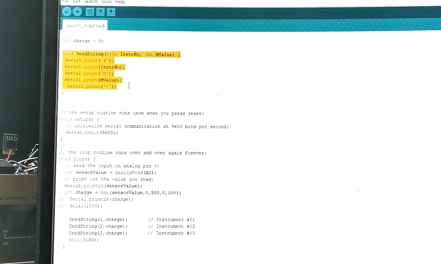 Just a few simple notes about the Arduino code. This is the string that is sent at the beginning and serves as a signal for the Windows application to accept the data sent by the Arduino. Then the baud rate is set to 9600 and finally we can experiment with these two values depending on the level of the detected signal and the position of the potentiometer P3. At the end of the code, values are sent to the three instruments that we will define in the Windows application.