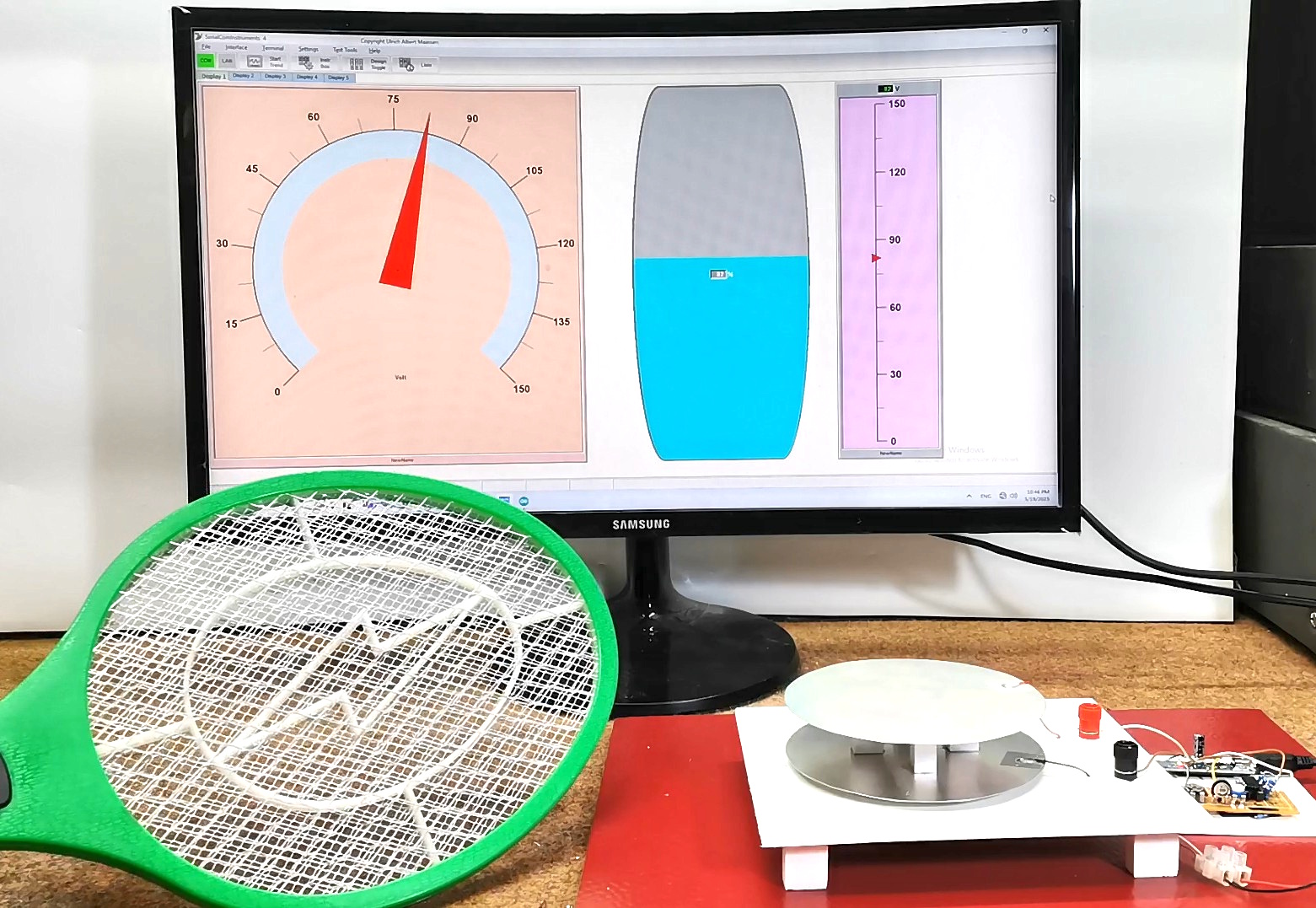 Now let's test the functionality of the device whose construction I have presented so far. As I mentioned at the beginning, with this type of detector, it is necessary to move the object (the ruler) over the plates if we want to instantly detect the charge. The instruments in the application show a momentary large deflection, which is a sign of the presence of a charge near the detector plates. Otherwise, this type of detector reacts equally to positive and negative charges. Now I will show you a special case of continuous monitoring of static charge generated by this mosquito killer in the form of a tennis racket. By pressing the button, a high-voltage electrostatic field is generated and under the influence of this field, the capacitor is charged, which consists of metal grids placed at a certain distance. If we connect the electrodes of the capacitor, it will discharge, generating a high-voltage spark.