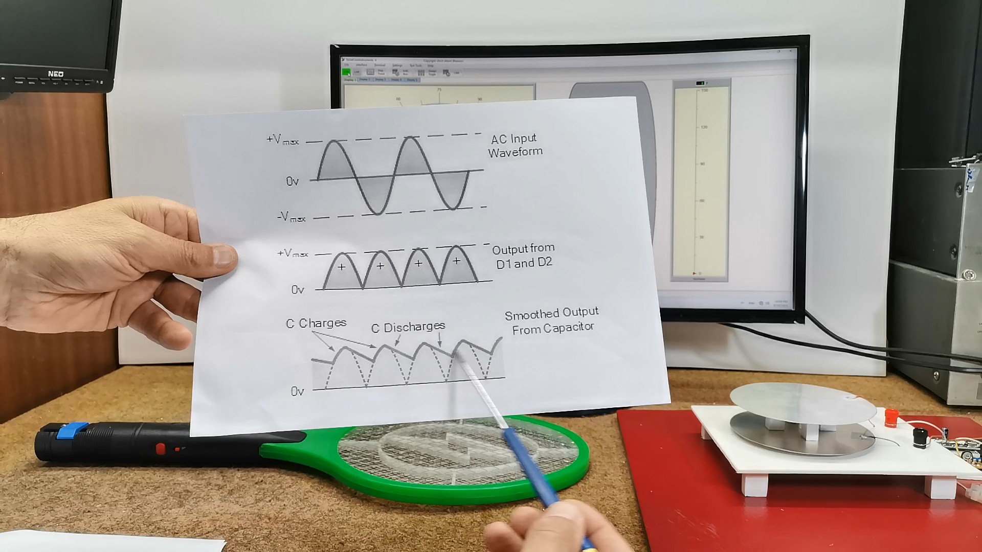 The final voltage which generates the electrostatic field and which charges the signals has the following form, so it is not ideally straight. So our detector detects these small fluctuations of the direct voltage, and these small changes simulate constant movement (vibration) of this source of static charge.