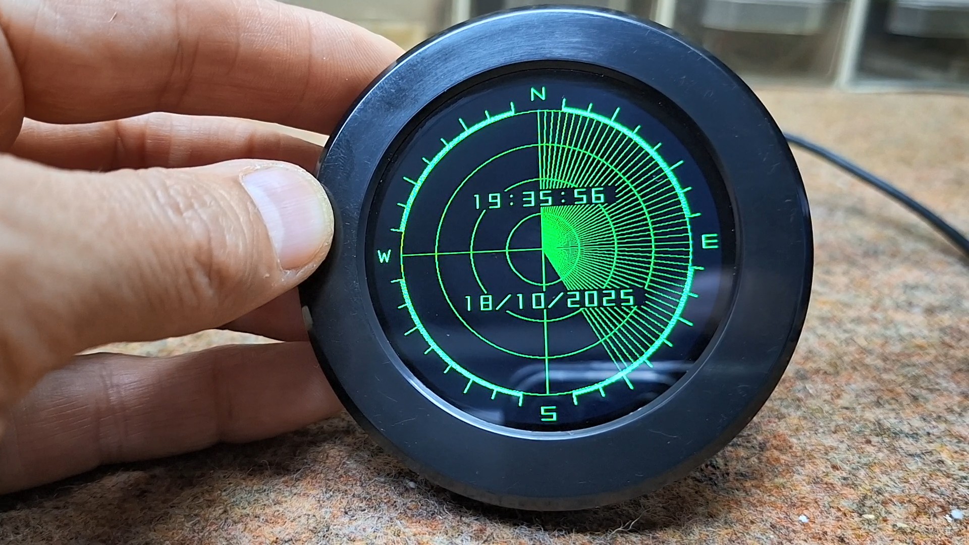 The exact time is downloaded via the Internet from an NTP server, so there is no need to manually set the clock. To demonstrate the functionality of the rotary encoder, I added a section in the code where the colors of the radar can be changed. Unfortunately, this video cannot capture the beautiful colors displayed on this high-quality display.