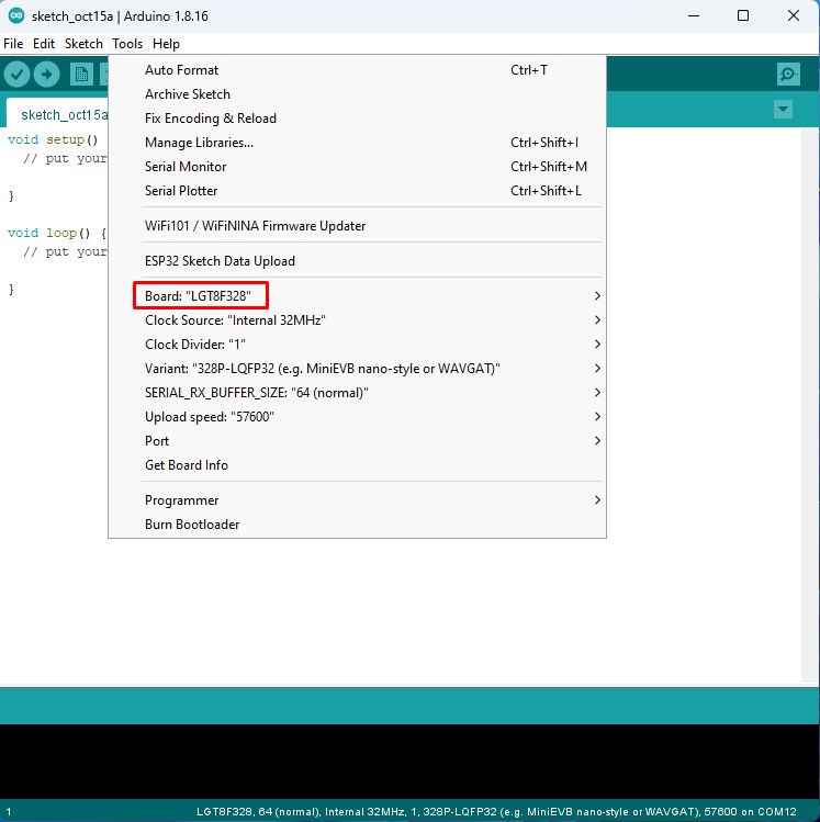 For support in Arduino IDE for LGT8F328P, we need to enter the given link (https://raw.githubusercontent.com/dbuezas/lgt8fx/master/package_lgt8fx_index.json) in File - Preferences - Additional Boards Manager, and then in Tools - Boards Manager we install this microcontroller.