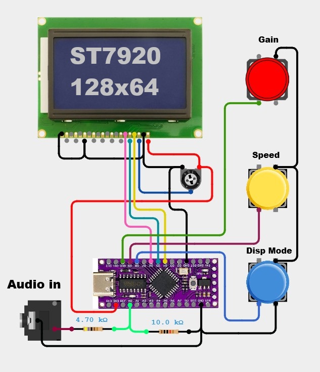An audio spectrum analyzer is an electronic device or software tool that measures and visually displays the frequency spectrum of an audio signal. It shows the different frequencies present in the signal and their respective amplitudes, typically on a graph with frequency on the horizontal axis and amplitude on the vertical axis. In today's video, I will present you with a very simple way to create an audio spectrum analyzer that, despite its simplicity, has many possibilities for adjusting various parameters directly via buttons, without making any changes to the code.
