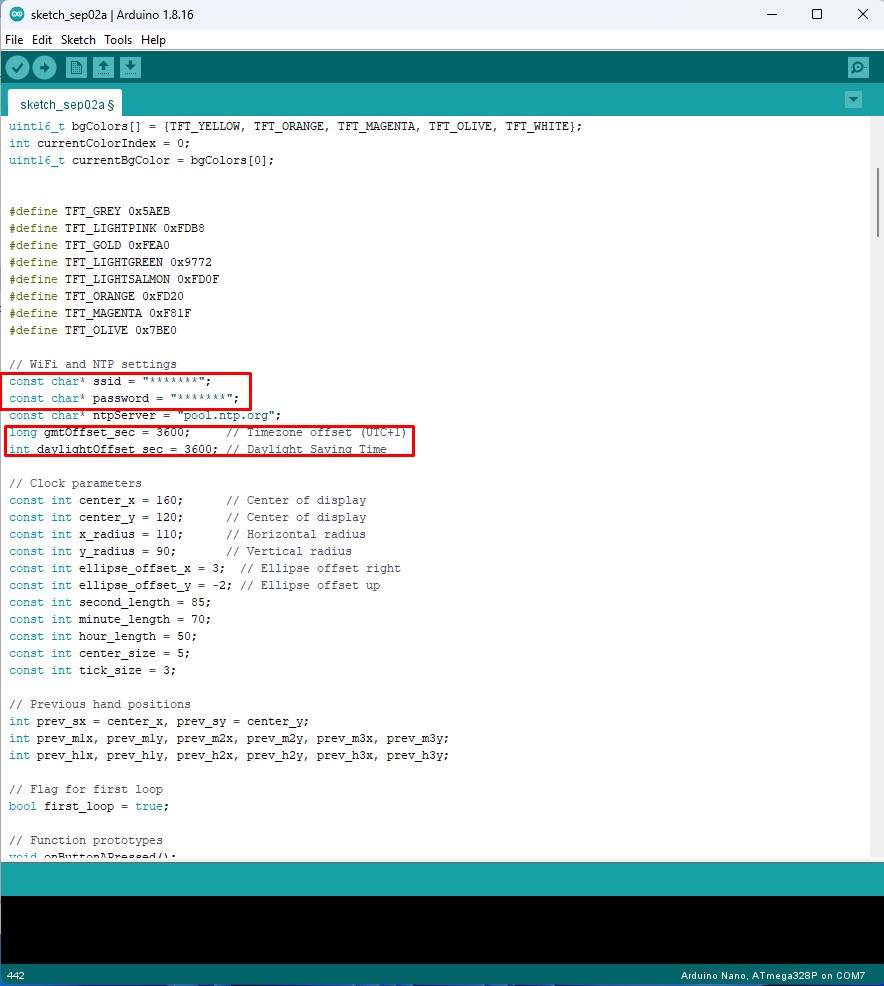At the beginning you need to enter your Wi-Fi credentials, the time zone you live in and Daylight Saving Time. Then the code is divided into several separate, easy-to-understand functions in which you can change various parameters and, if you have the time and desire, create your own clockfaces.