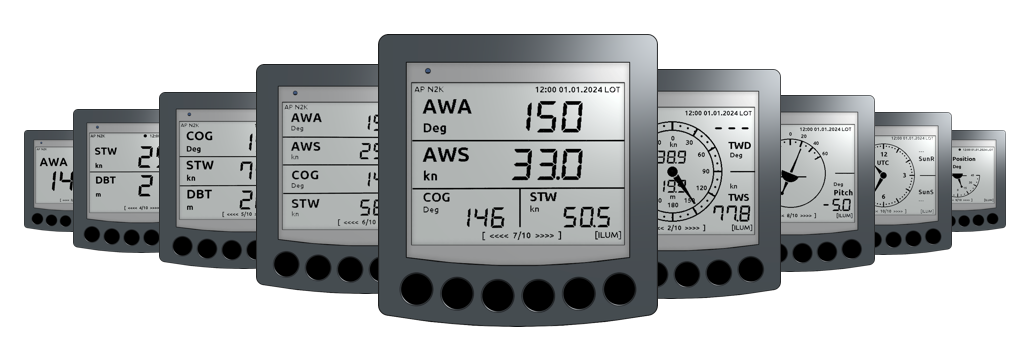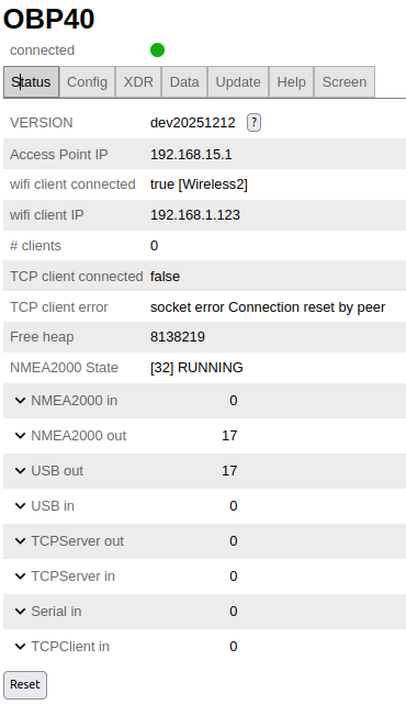 The OBP40 can display a wide variety of data in numerical or graphical form. The firmware is available as open source, and the display pages can be customized and modified by the user, allowing for the creation of individual display layouts. To use the display as a marine multifunction display, a pre-compiled firmware is available, which can be installed via a web flashing tool using a USB cable. Basic configuration of the OBP40 is done via a web interface accessible via Wi-Fi. Afterward, it is possible to switch between different display pages. Data from the boat's network is transmitted to the OBP40 via Wi-Fi. It is also possible to connect CAN and RS485 drivers to the expansion port and read data directly from the bus systems.
