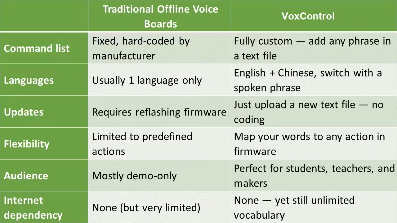 With VoxControl Kit, that’s exactly what happens. Just open a text file, type in your command — “GO FORWARD”, “DANCE TANGO”, or even “打开灯” (turn on the light) — upload it to the board, and your robot understands it right away.