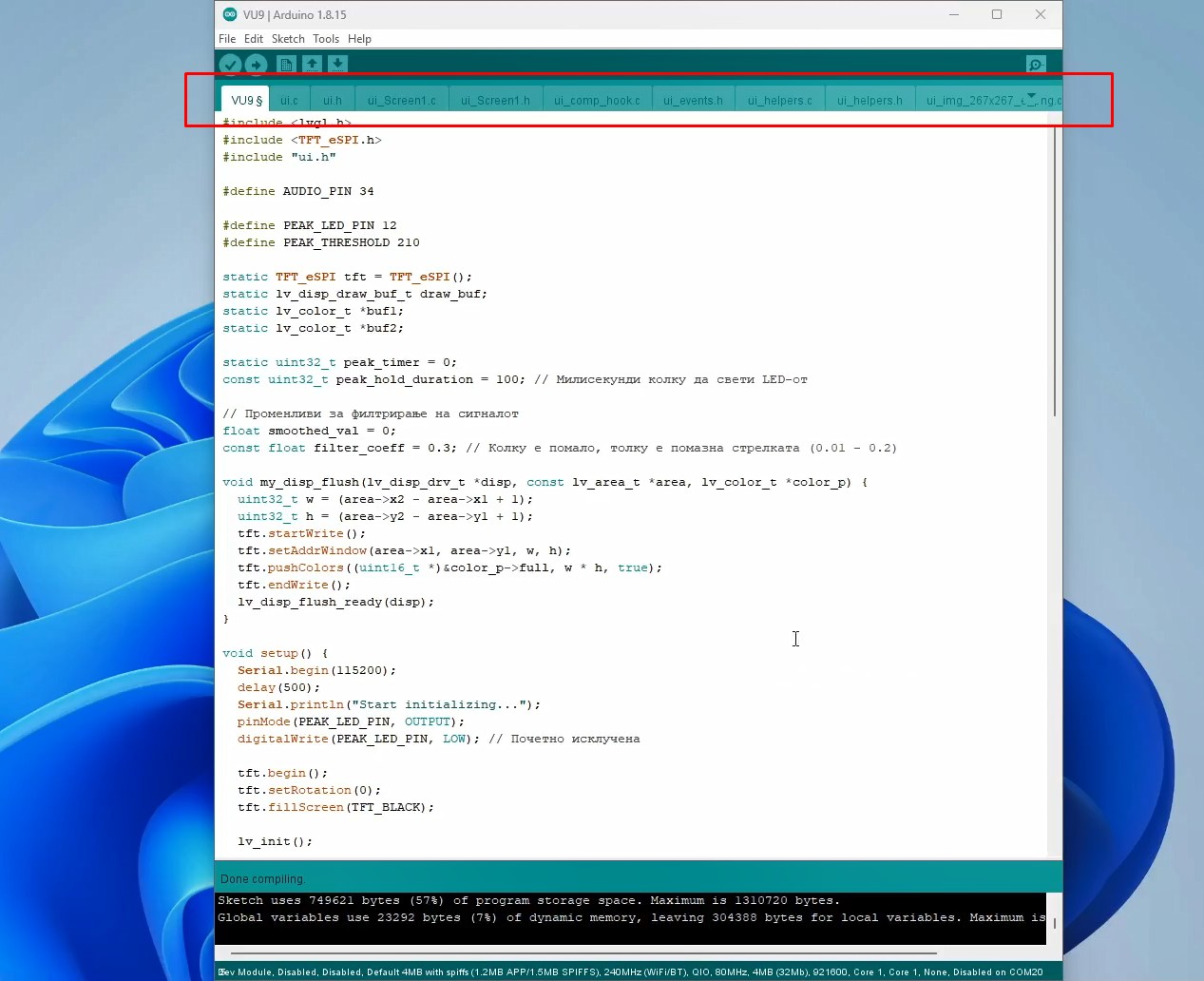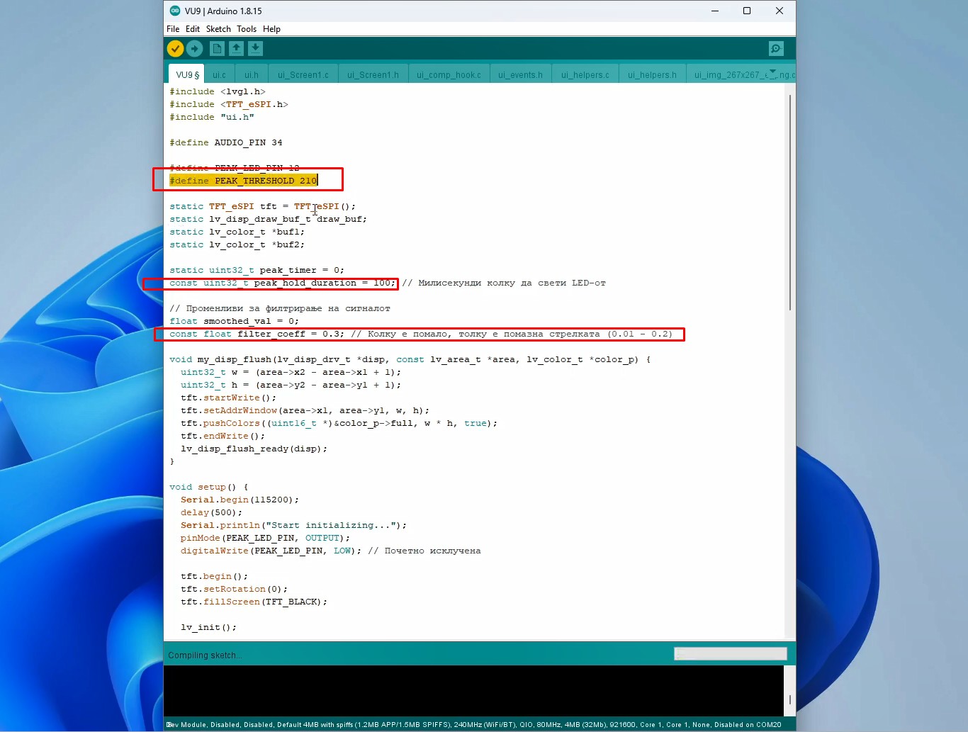 To briefly mention that I am using Arduino IDE version 1.8.16, ESP32 Core ver. 2.0.14 and LVGL library ver. 8.3.11. The name of the folder containing the code files should be the same as the name of the .ino file inside the code. Now we simply run the .ino file and compile and upload the code. We make the basic settings directly in this file.