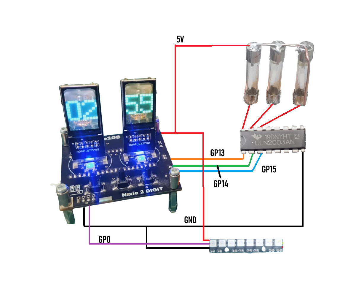 Powered by a Raspberry Pi Pico 2 + CircuitPython and synced with a DS3231 RTC, the system manages multi-layer displays, binary hardware outputs, and animated light effects with impressive accuracy.
