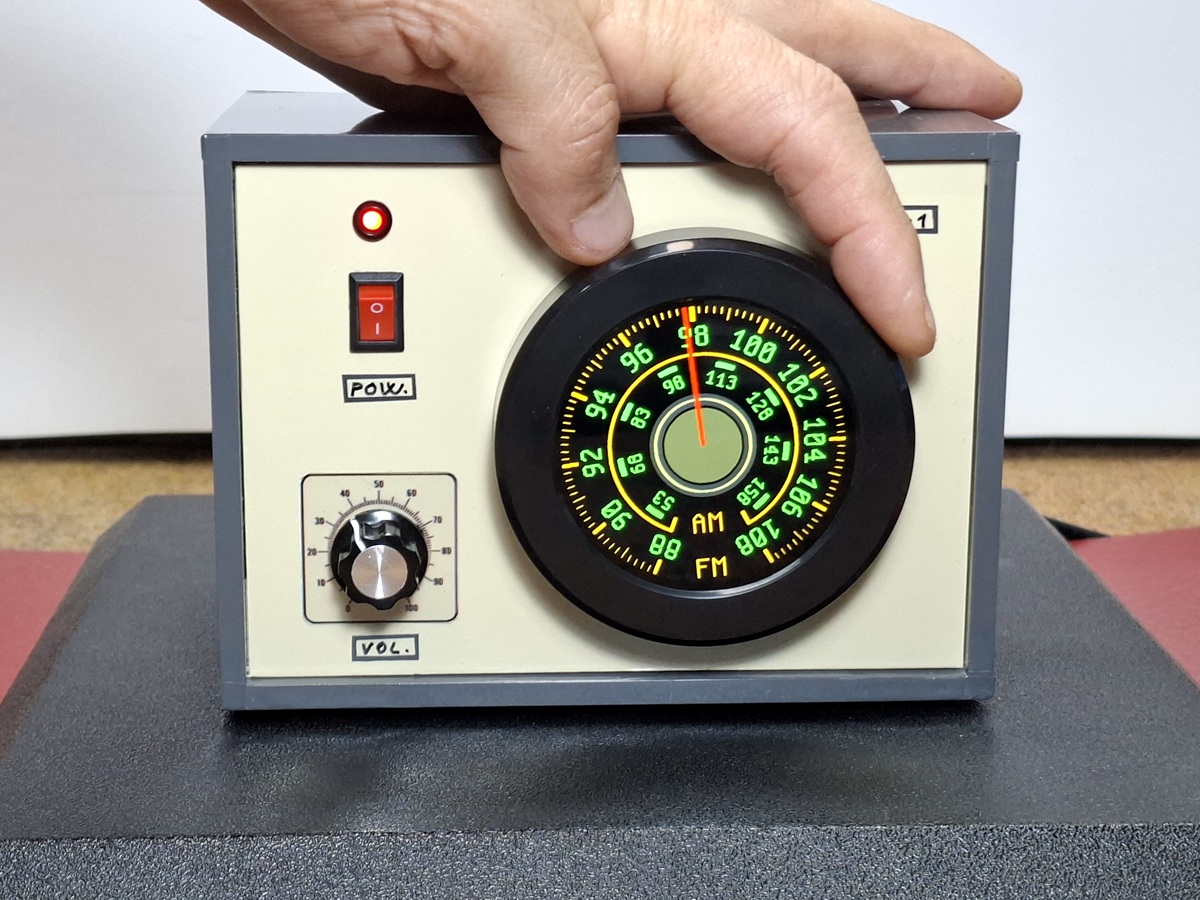 Now let's see how the device works in real conditions. Immediately after turning on the radio, a retro-style scale with characteristic green and warm yellow colors appears on the round display. There is also a red arrow that shows the selected frequency. By moving the rotary encoder, the arrow moves accordingly. The initial position of the arrow, i.e. the frequency, is entered into the code as desired. You can also see that under the FM scale there is an AM scale, which is actually just a visual detail and has no practical function in this particular project.