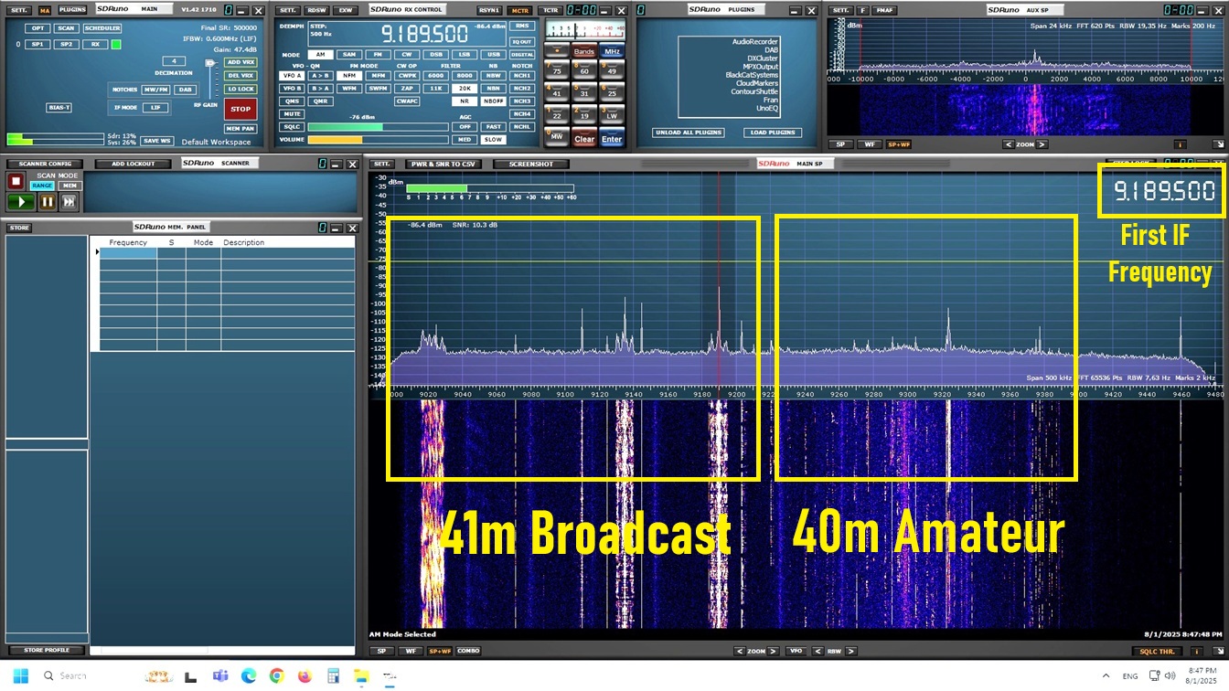 I took power from the mains transformer through a rectifier, and the output signal from the buffer comes out through this hole and should be connected to the Antenna input of the SDR receiver. Now we will look at the signal spectrum of the entire 41m Broadcast band, as well as the 40m Amateur band. In fact, these are the frequencies on which I had the best reception at the time of recording this video. First of all, on the SDR Uno software, we need to set the first IF frequency of the radio receiver, and in this case it is about 9.1 MHz and start SDRUno software. Now, we need to set the preselector knob of the radio to the position where we have the best reception. This is the spectrum of the entire 40m and 41m band.
