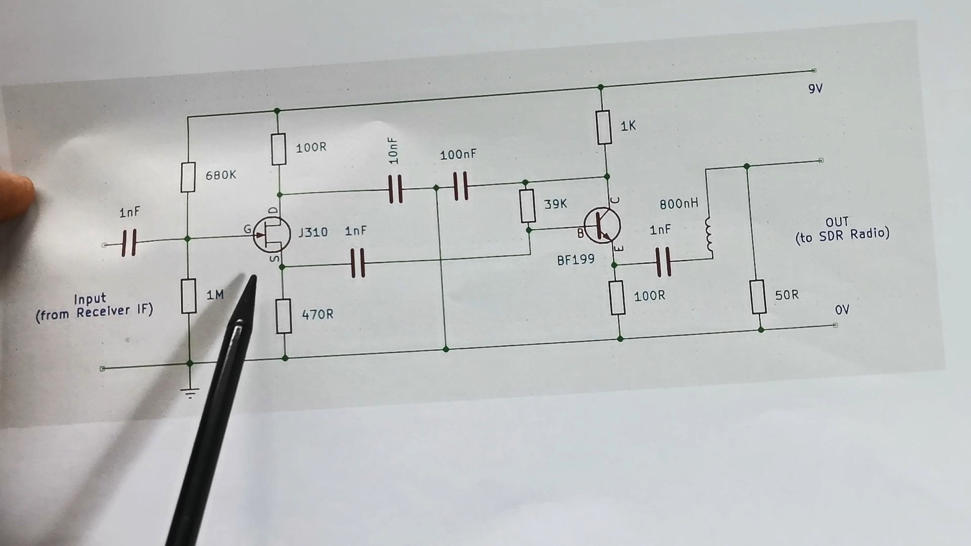 And now a few words about the buffer board. Tube radios are often very high impedance signals. They’re meant to drive loads into the hundreds of kiloohms or even into the megaohms. If you take a regular amplifier designed for a 50 Ohm input impedance, you’ll suck the signal right out of your radio and there will be nothing. You’ll completely load down the receiver. Therefore, the buffer amplifier shown in the diagram below has a very high input impedance, and a low output impedance, so it does not affect the received signal at all. The buffer has two active stages - a JFET source follower to present a high impedance to the IF filter, and therefore minimise any loading on the main signal path of the radio.