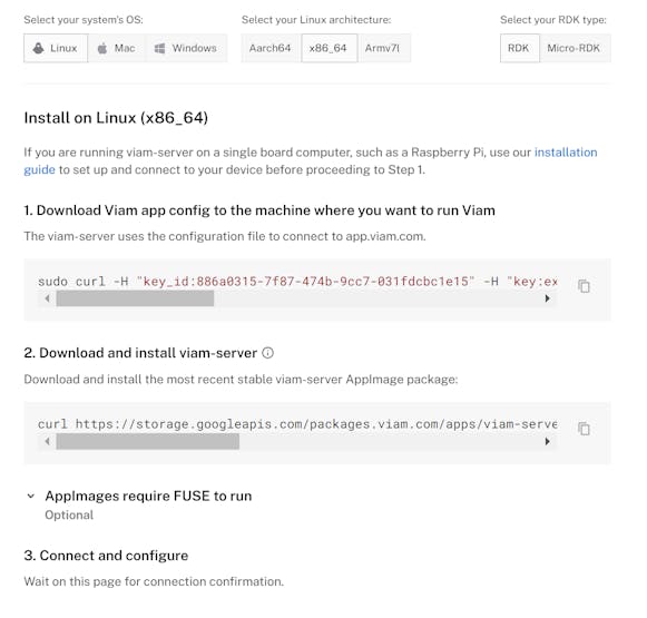 So we can start creating our smart machine. The process is pretty simple. First we logged onto the VIAM app and created a new machine. Then we installed the VIAM server by running these commands which are given in the image below. Just follow this guide if you have any doubts.