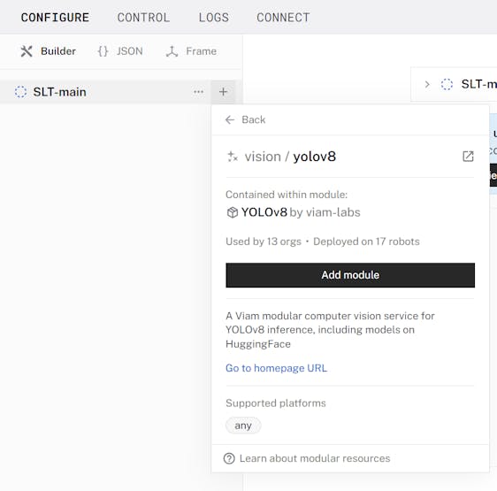 While Viam's default mlmodel vision service is compatible with Tensor Flow Lite models, this project employs a YOLOv8 model. To achieve this, we'll utilize a module from the modular resource registry designed to enhance Viam with YOLOv8 integration.
