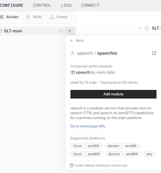 For that, we used the speech service from VIAM. It is a modular service that provides text-to-speech (TTS) and speech-to-text (STT) capabilities for machines running on the Viam platform.