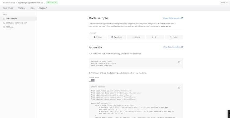 To run this project we are using their Python SDK and they also provide a 70% completed code snippet to get started with. To install the Python SDK just go to their connect tab.
