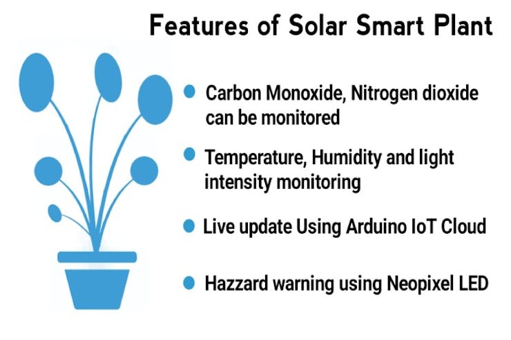 So, in this project, I am making a solar smart plant aiming to solve some of these problems. With this solar plant, we can detect/monitor the environmental conditions through our smartphones and computers. Which includes atmospheric levels of carbon monoxide, and nitrogen dioxide. In addition, we can monitor light intensity, temperature, and humidity. The plant has inbuilt lithium-ion batteries which automatically recharge using solar energy, also it has a deep sleep mode, so we don't want to care about power issues.