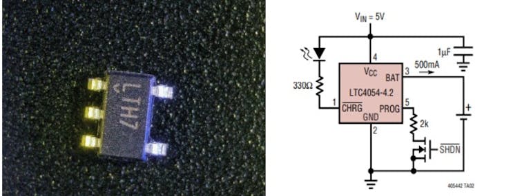 The LTC4054 is a complete constant-current/constant-voltage linear charger for lithium-ion batteries. Its Thin SOT package and low external component count make the LTC4054 ideally suited for our application.