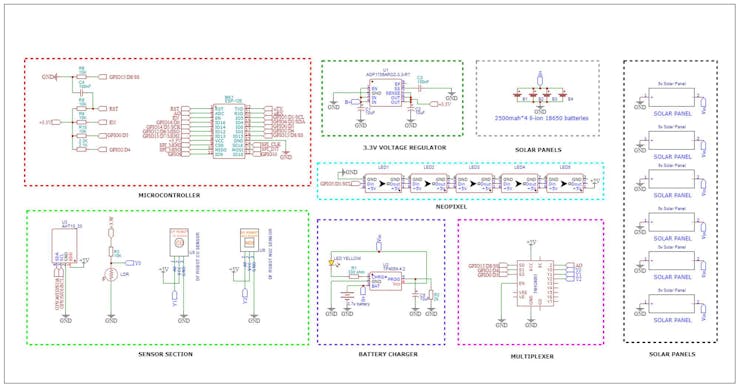 Here is the circuit diagram. The working of this circuit is as follows. The AHT20 sensor is an I2C sensor so I connected the SDA and SCL pins of the sensor to the SDA and SCL pins of ESP12E. Then we have 3 analog sensors (CO, NO2 and LDR). I have connected these sensors to the multiplexer(because esp12e has only one analog input), the control pins of the multiplexer I have connected to the digital pins of the ESP and the output pin to the A0 pin of esp12E. So we can read the data of each sensor one by one. I have added the complementary components for esp12e, voltage regulator and li-ion battery charger for proper working. Here we have LTC4054ES5 IC for charging the li-ion batteries. The output of battery charger is directly connected to the li-ion battery pack (4*3.7li-ion batteries). we have a total of 6 solar panels and each of them can deliver 80mA. So the total current is about 480mA when the panel is in parallel connection. In the circuit I have connected the input of The Li-ion battery charger to the output of solar panel. Then the regulator converts the 3.7v to 3.3v and feeds to the microcontroller. Download the circuit from here.