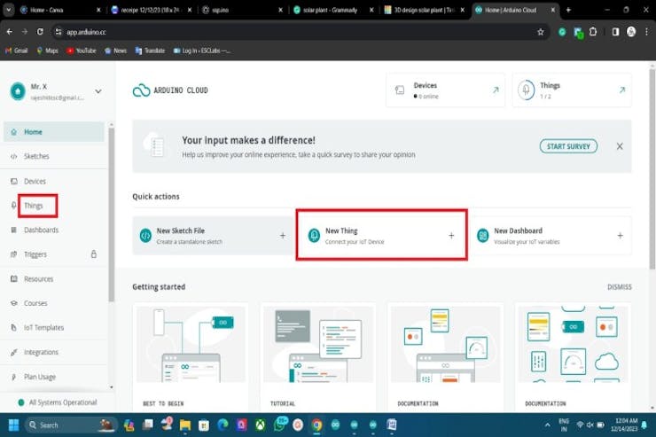 We need to create an account in Arduino IoT Cloud to use the features that go to Arduino IoT cloud and login/sign up with your email ID. We need to create a thing on iot cloud for that Click on thing and click create. Then name the thing here I named a solar smart plant.