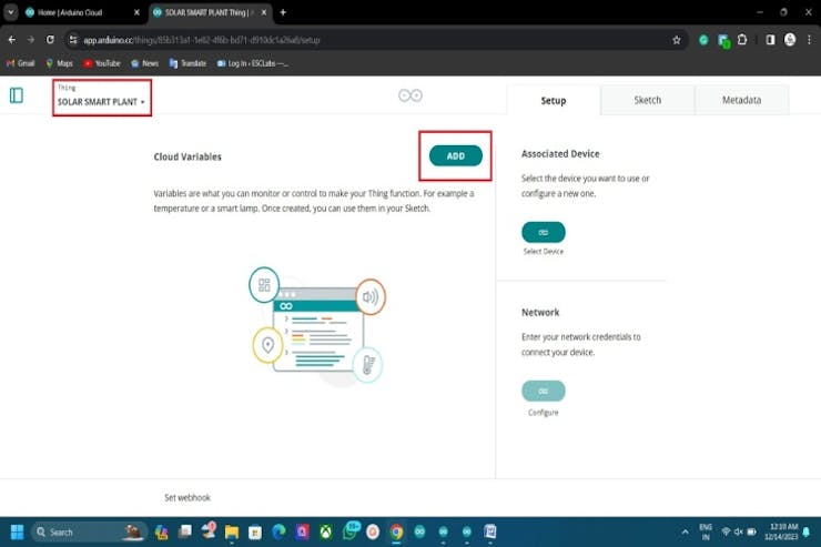 Then click on add cloud variables. These variables are for storing our data. In our case, we need to store light intensity, temperature, humidity, carbon monoxide level and nitrogen dioxide levels.