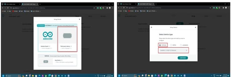 The next step is to set up the device. So click on select the device and click on setup new device then select third-party device because we are using esp12e. From the menu device type menu select esp8266 and then select Node MCU. Also name the device.