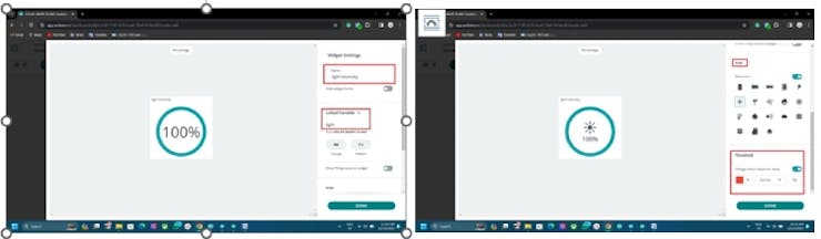 To display these variable values, we need a dashboard so let's set up the dashboard. For that go to the dashboard and click on Create Dashboard then name the dashboard, I named as Solar Smart Plant. Click on Add to select a widget, we have a lot of options to display the values in different styles. First, I selected the percentage widget. You can name the widget as you wish, I am going to use this widget to display the light intensity, so I named the widget as light intensity. Now click on the link variable and select the previously created int variable (light). We can select icon and the color-changing feature if we want, that is we can set a value to change color for example if the value goes below 50, we can set the color to change to red. after selecting these we are done with the first widget. I did the same for humidity.