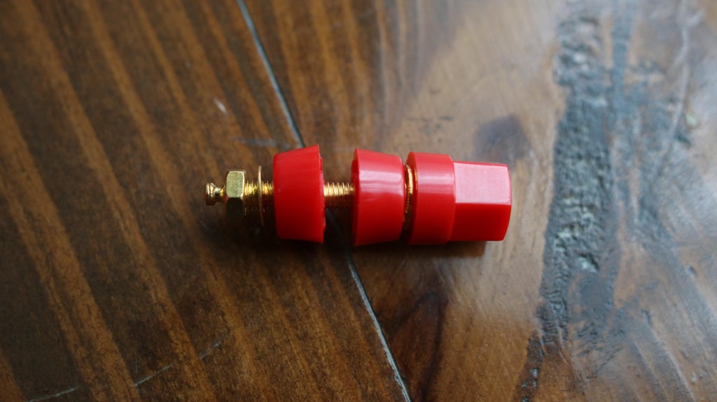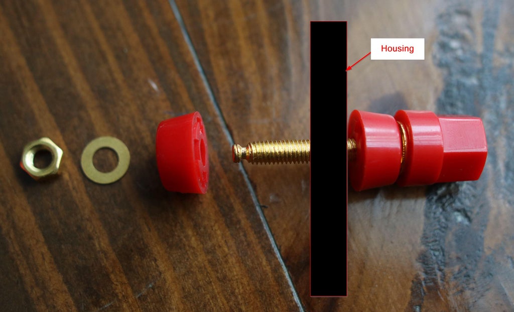 Insert the banana plugs into the housing, then install the clamping piece, washer and nut.