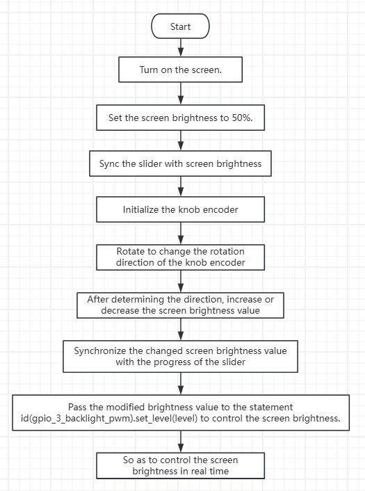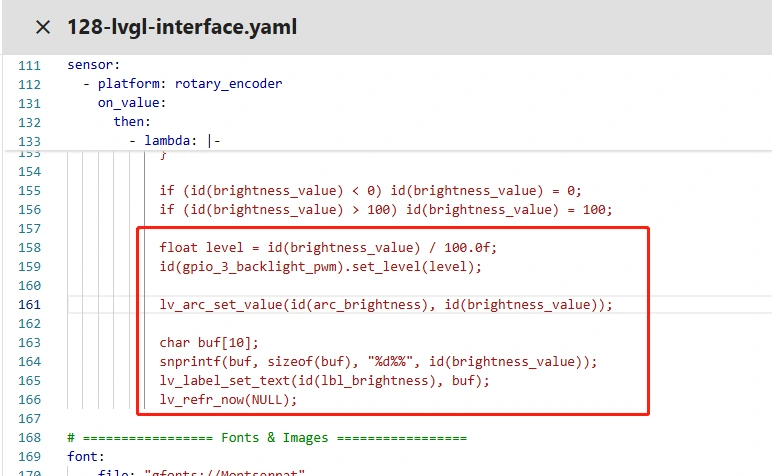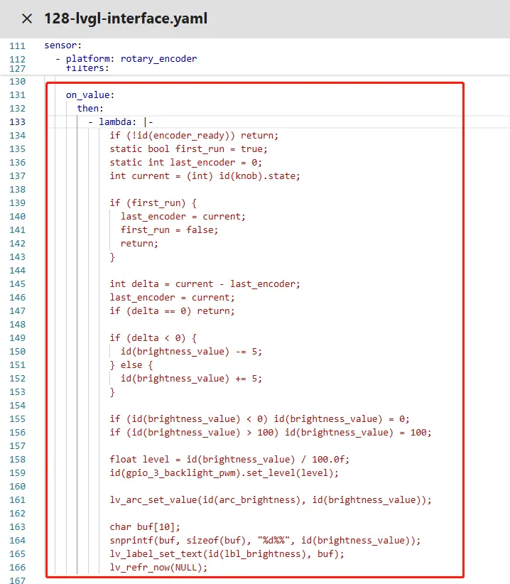 The Lambda code under on_value is the core logic to adjust the backlight brightness via the rotary encoder and sync with the LVGL interface. Each rotation step triggers execution, following a closed-loop process: "validate to prevent misoperation → calculate rotation increment → adjust brightness with range limit → update hardware backlight → sync visual interface".