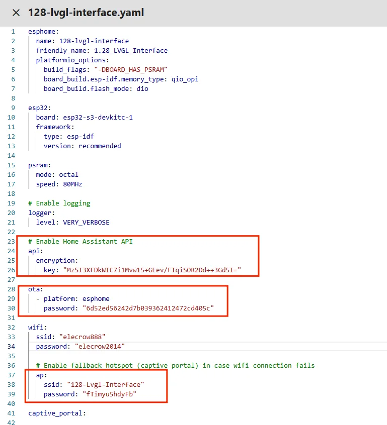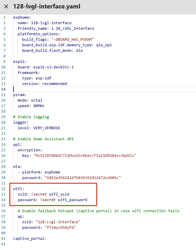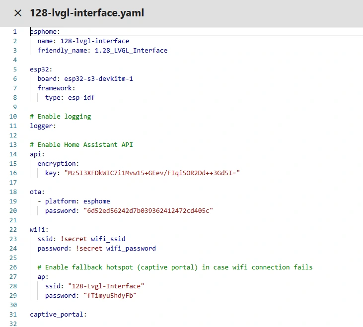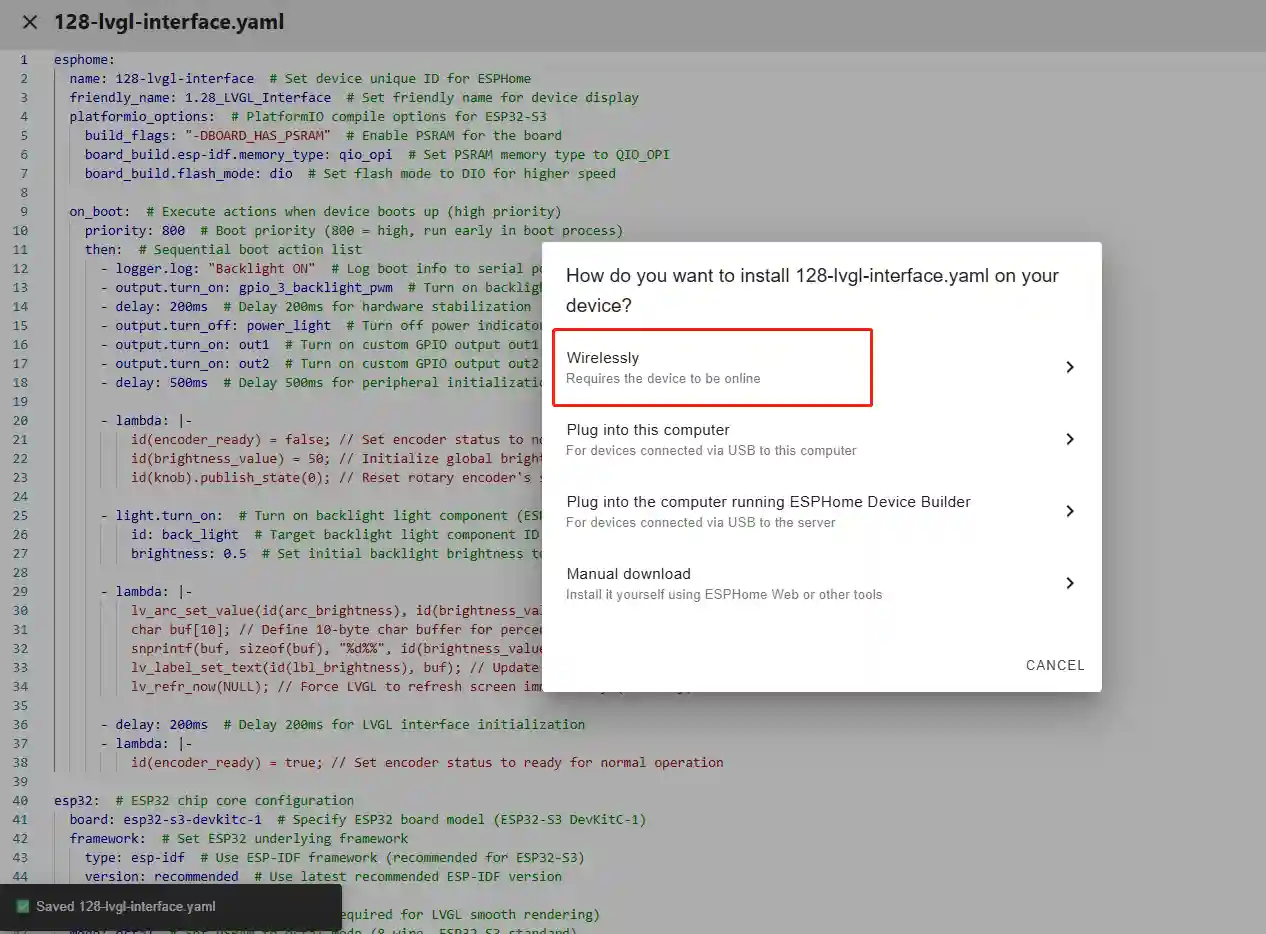 This code is the complete LVGL configuration in ESPHome, building a brightness adjustment interface for the 240x240 1.28-inch round GC9A01A screen. It first associates LVGL with the screen, then defines four layered widgets from bottom to top to create a clear, circular brightness display interface.