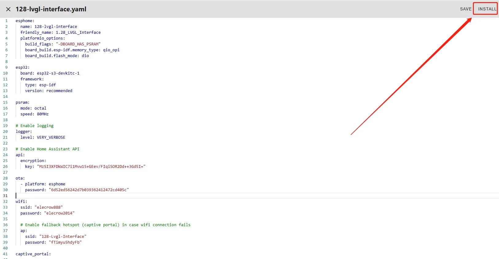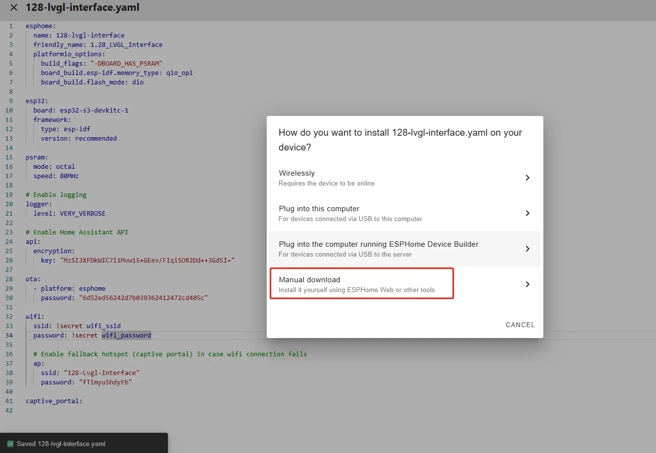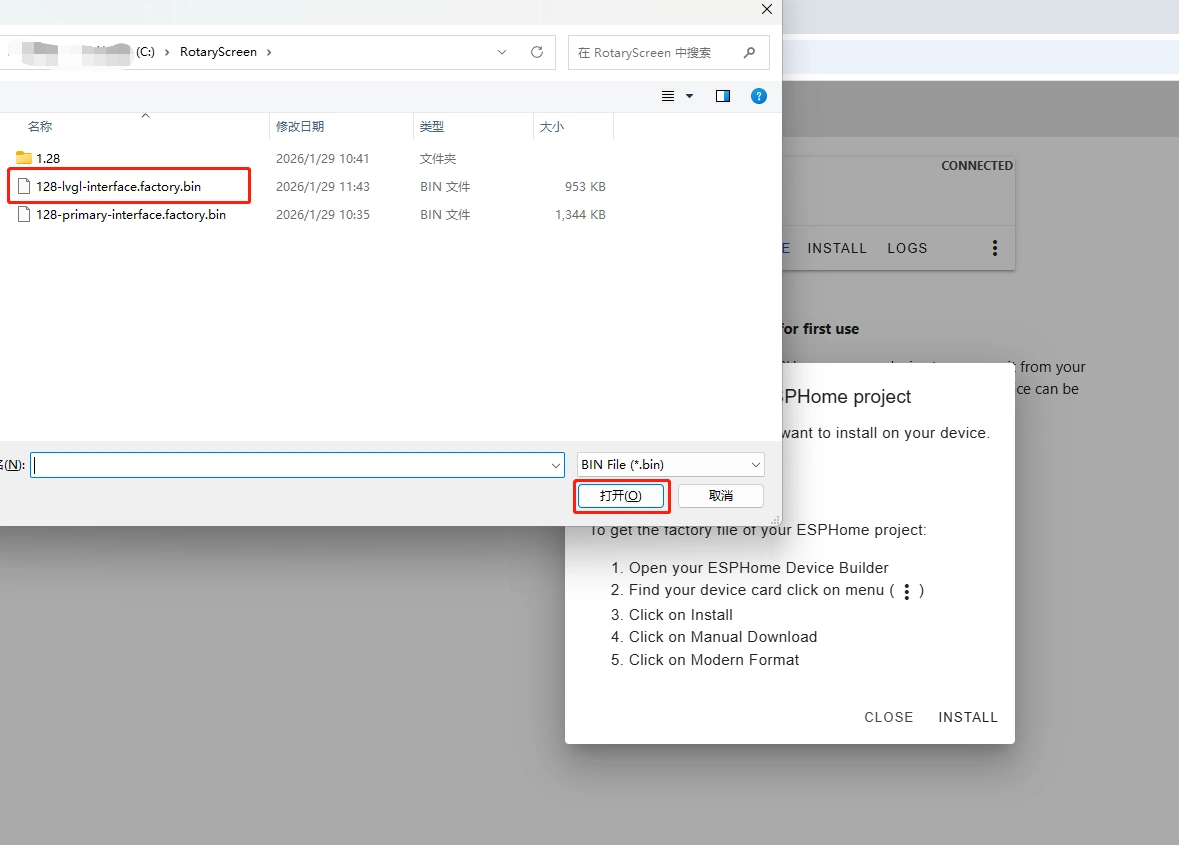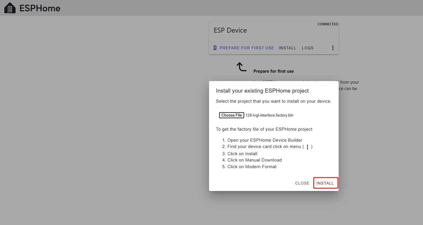 After connecting the CrowPanel 1.28inch-HMI ESP32 Rotary Display , click "Install".