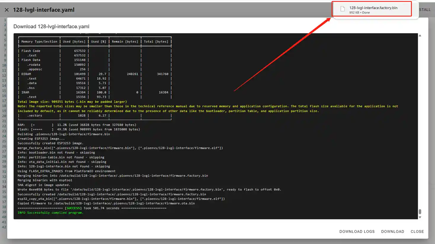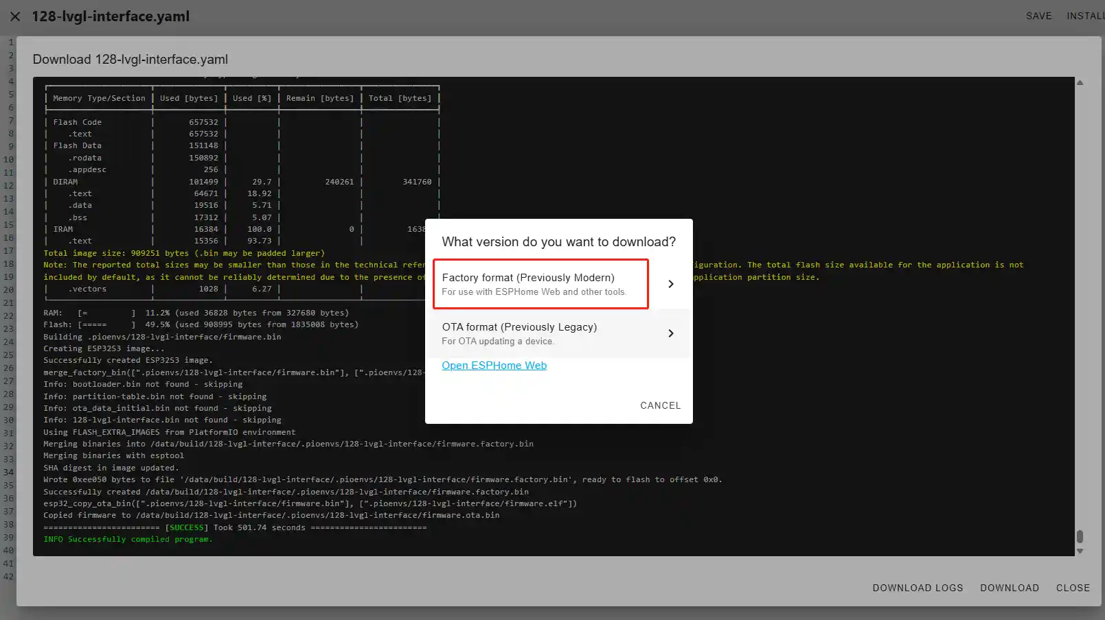 After successfully flashing the .bin file, return to the ESPHome page in Home Assistant.