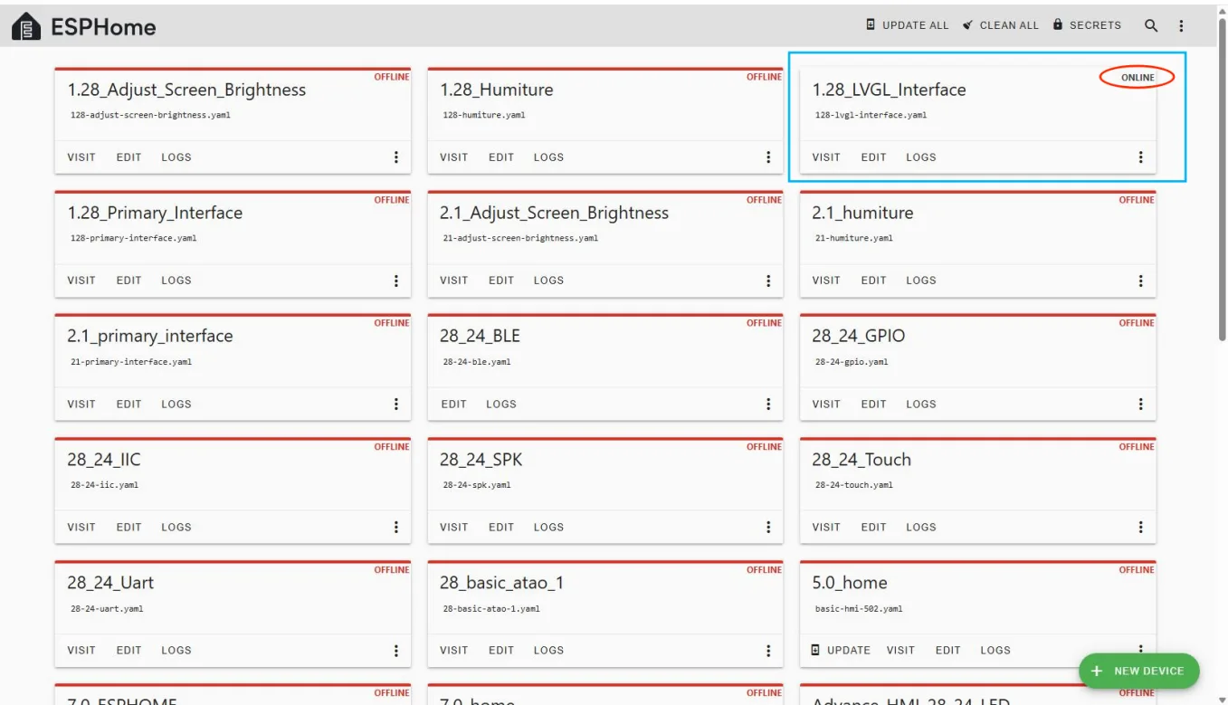 Restart the ESP32 display, and you should see the device you created earlier show as ONLINE in the top right corner.