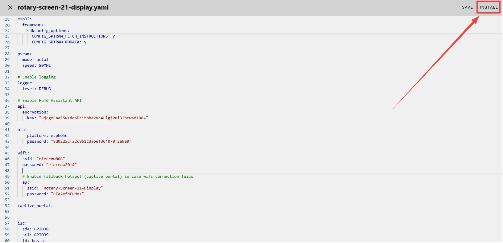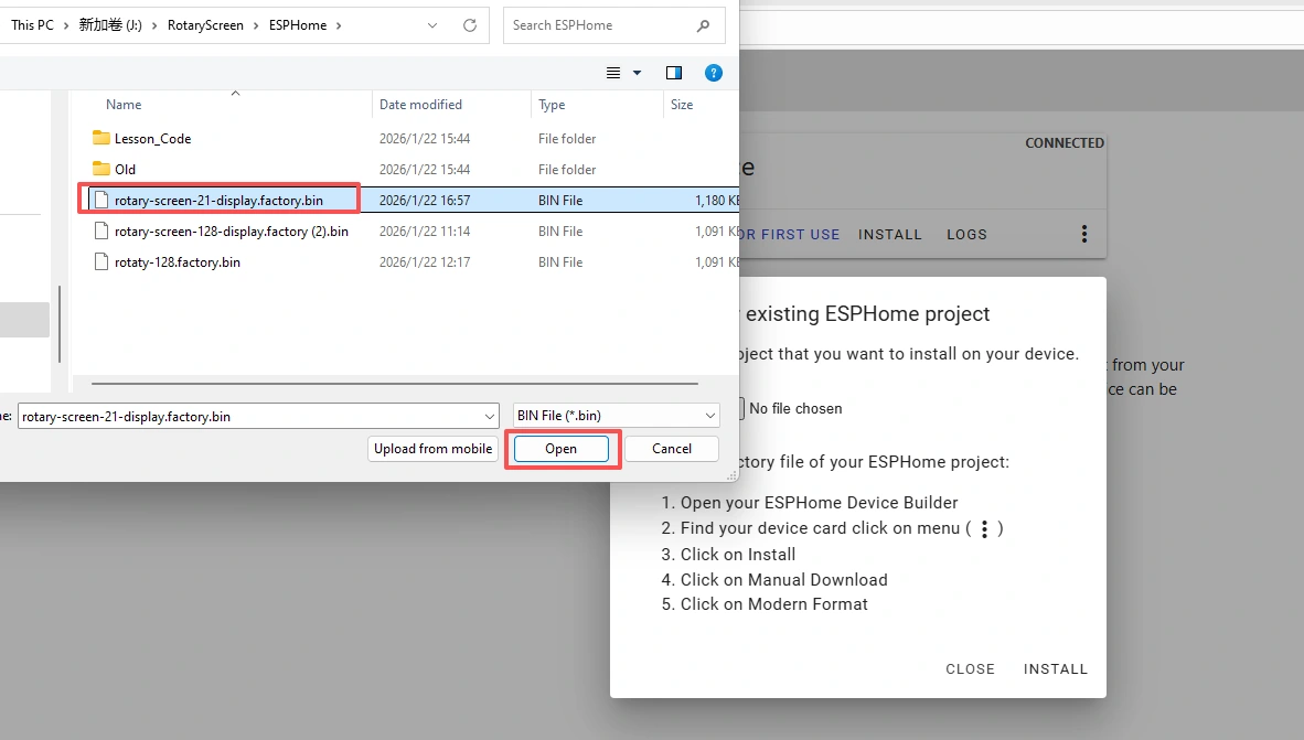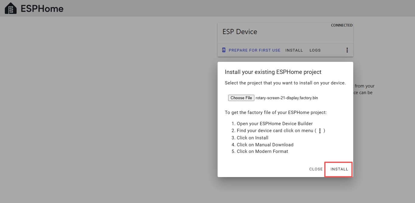 After connecting the CrowPanel 2.1inch-HMI ESP32 Rotary Display, click “Install”.