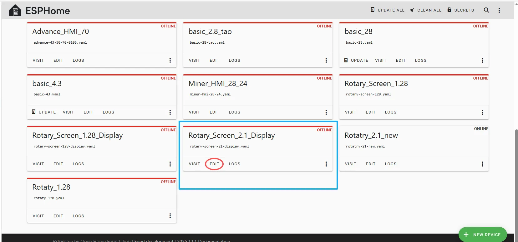 Then return to the main interface, find the Rotary_Screen_2.1_Display you just created, click “EDIT,” and enter the code editor.