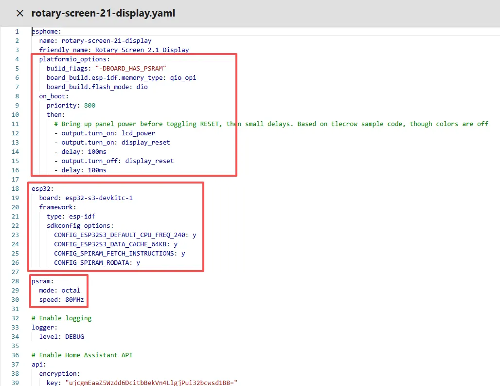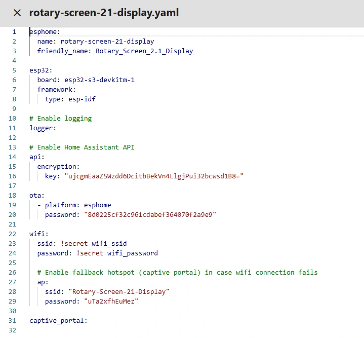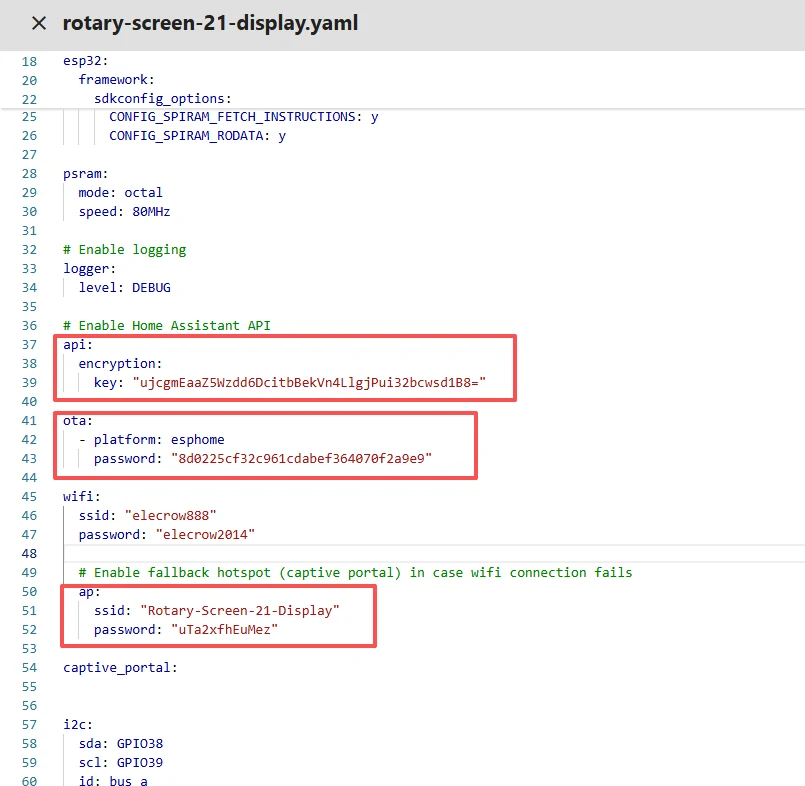 The esphome configuration block is the core foundational configuration of the 2.1-inch rotary display device. It defines both the system identifier and display name of the device (name is the unique system identifier rotary-screen-21-display used for ESPHome compilation, communication, and device management, while friendly_name is the human-readable name Rotary_Screen_2.1_Display for intuitive identification in interfaces such as Home Assistant).