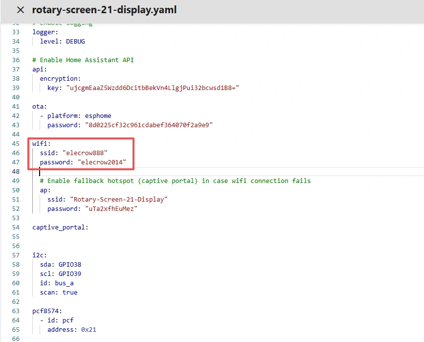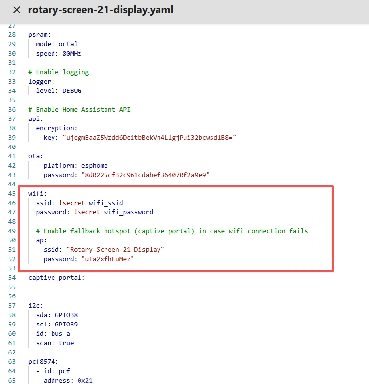 This section configures the I2C peripheral expansion and the core control pins of the display. It first initializes an I2C bus with GPIO38 as SDA and GPIO39 as SCL (id: bus_a) and enables bus scanning, used to communicate with the PCF8574 I/O expansion chip at address 0x21 — this chip is responsible for expanding critical pins such as touch reset, LCD power/reset, and encoder button.
