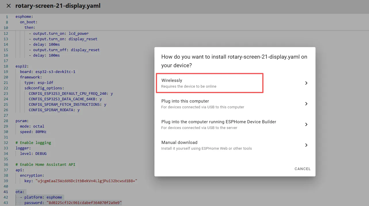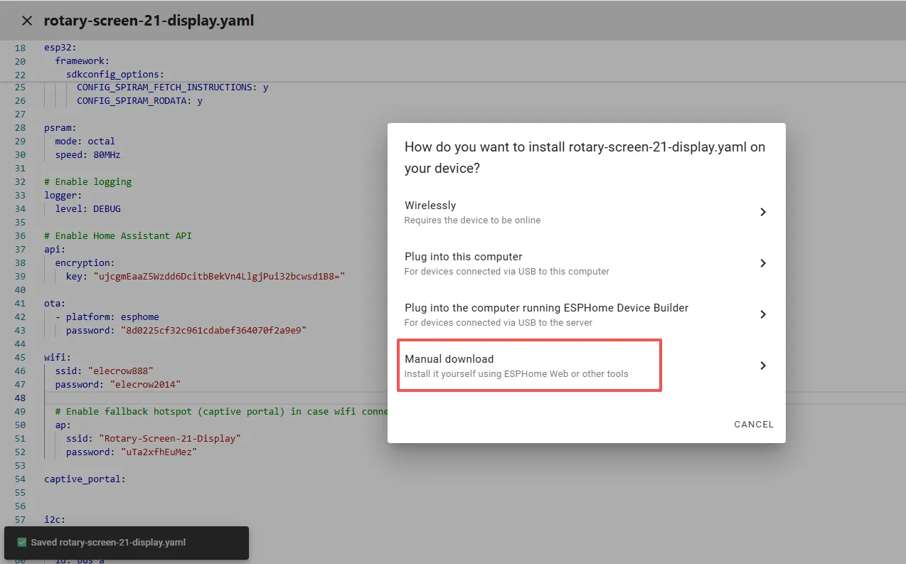 In this lesson, we will use ESPHome to write code to light up the CrowPanel 2.1inch-HMI ESP32 Rotary Display and display “Hello World” on the screen.
