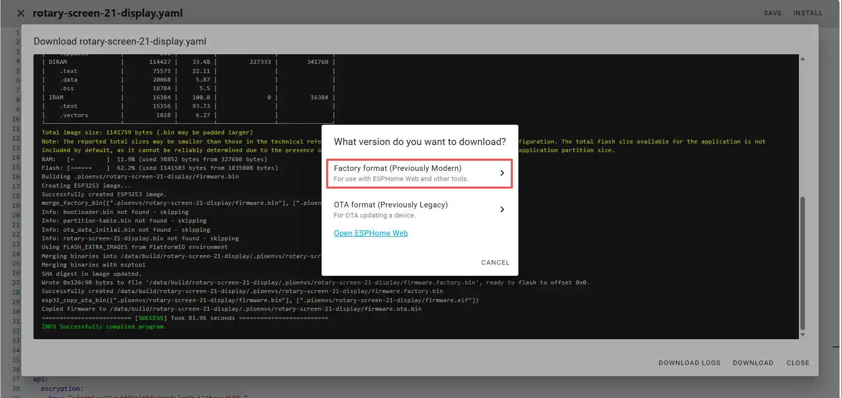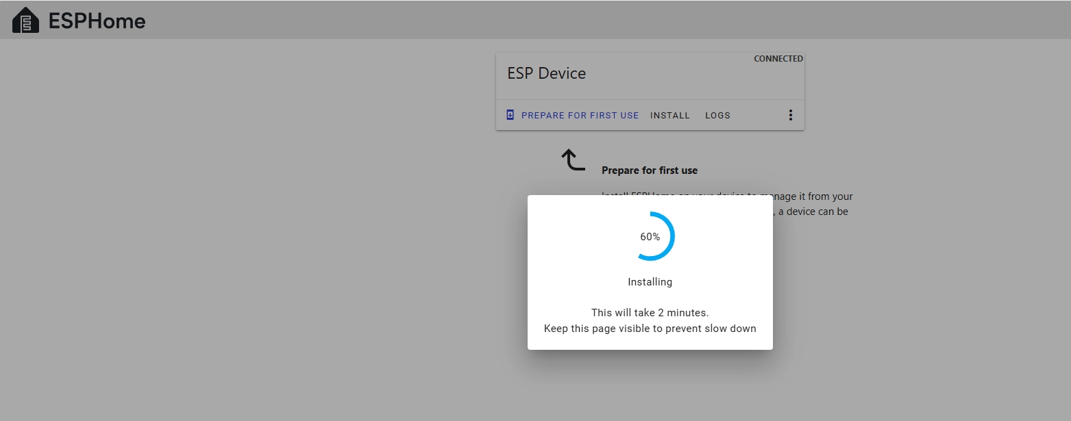 After successfully flashing the .bin file, return to the ESPHome page in Home Assistant.