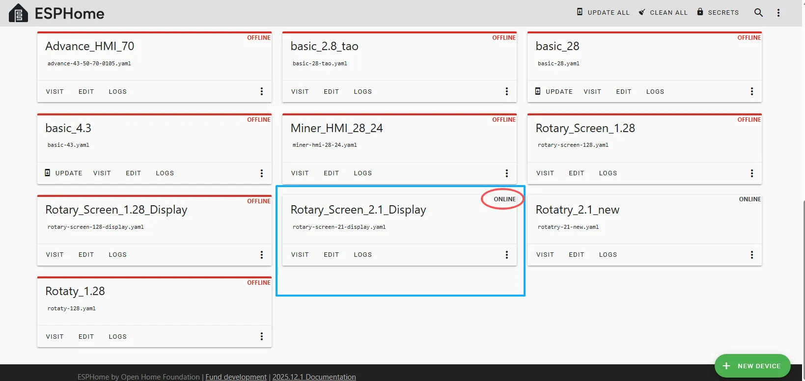 Restart the ESP32 display, and you should see the device you created earlier show as ONLINE in the top right corner.