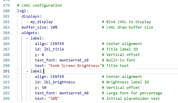 This code configures the LVGL graphics library in ESPHome: it binds the "my_display" display to LVGL, allocates 50% of the buffer for drawing the interface, then creates two label controls: the first "lbl_title" is centered at the top of the screen, displaying the title “Knob Screen Brightness” with the "montserrat_28" font;