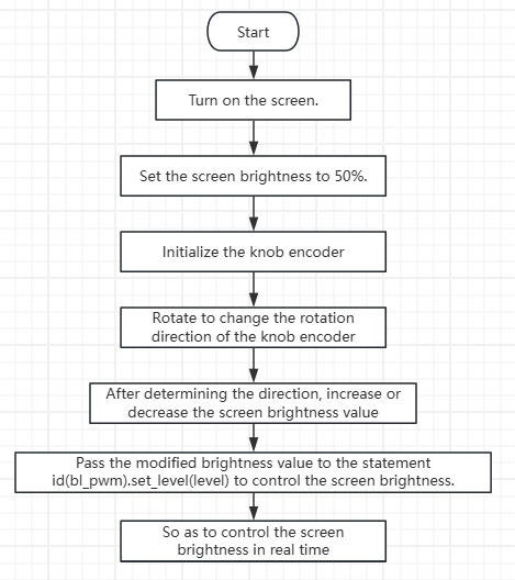 When the system starts, the LCD is first powered on and goes through a strict reset sequence to ensure the screen hardware is in a stable state. Then there is a delay to wait for the rotary encoder to stabilize after power-on, preventing false triggers. On this basis, the actual backlight output brightness is set to 50%, and with the knob input frozen (encoder_ready = false), the software internal brightness variable brightness_value is set to 50. At the same time, publish_state(50) is used to force-align the internal count of the rotary_encoder so that the "knob logical position, software brightness value, and actual PWM brightness" are fully consistent.