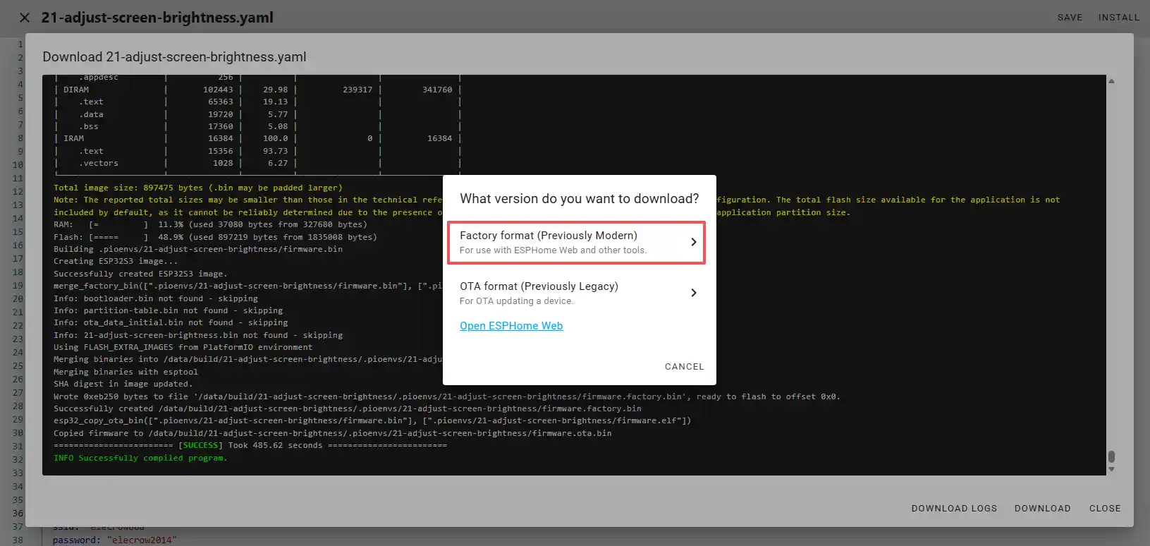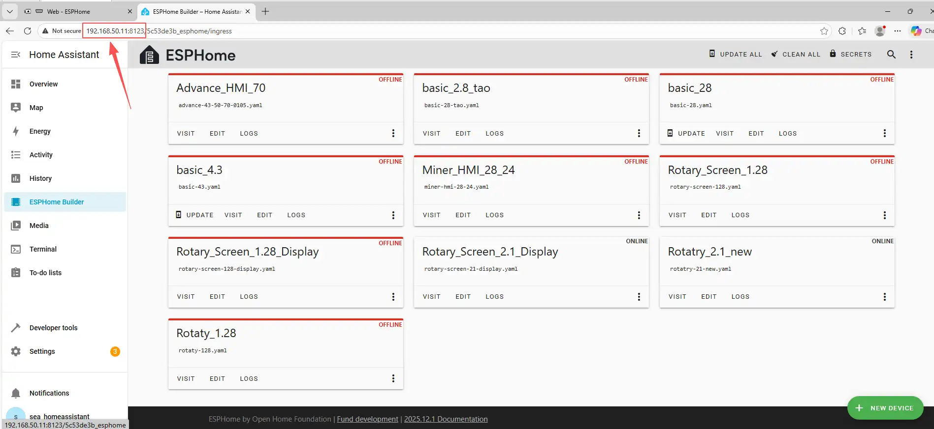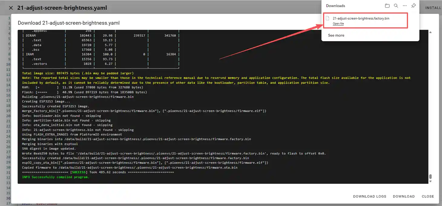 After successfully flashing the .bin file, return to the ESPHome page in Home Assistant.